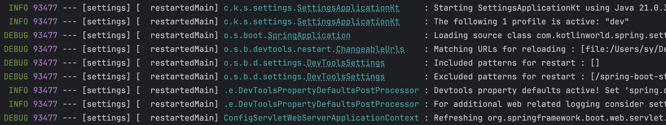 그런 후 애플리케이션을 실행하면 다음과 같이 DEBUG로그가 나오는 것을 볼 수 있다.