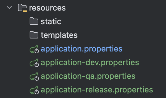 이러한 파일들은 기본적으로 application-[개발 환경].properties이라는 이름을 가지며, 만약 Dev, Qa, Release별로 다른 설정 파일을 만들어야 한다면 이들의 이름은 application-dev.properties, application-qa.properties, application-release.properties가 된다.