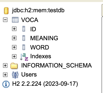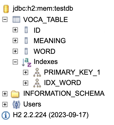 그러면 다음과 같이 VOCA_TABLE이라는 이름을 가진 테이블이 생성되고, IDX_WORD라 불리는 WORD를 인덱싱한 인덱스가 생성되는 것을 볼 수 있다.