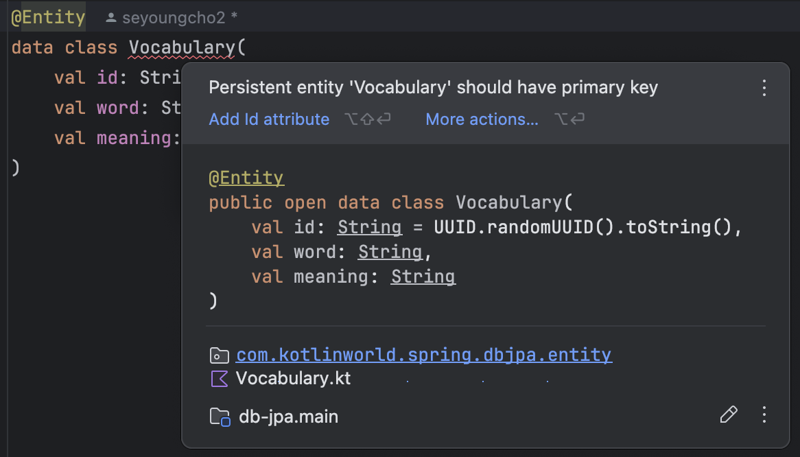 영속성 엔티티인 Vocabulary는 Primary Key가 있어야 합니다.