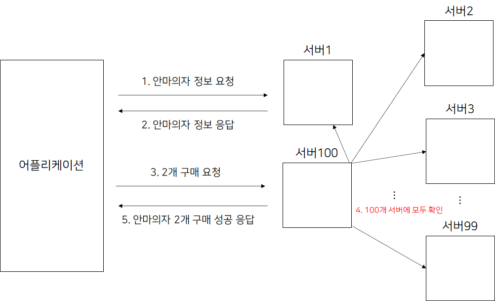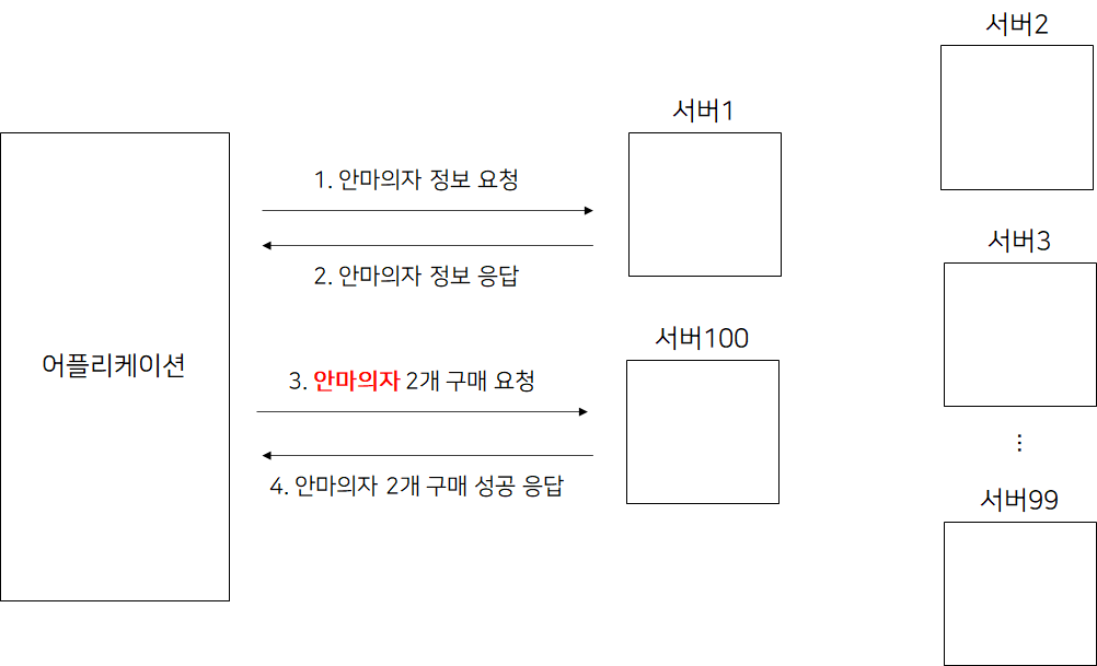하지만, 서버가 1번부터 100번까지 100개가 있고 유저가 안마의자 상품에 대해 정보를 요청한 것을 1번 서버만 알고 있다고 하자. 유저의 2개 구매 요청을 받은 서버는 100번 서버이다. 이 때 100번 서버가 유저가 조회한 것을 알기 위해서는 1~99번 서버에 대해 유저가 상품을 조회한 기록이 있는지 살펴봐야 한다. 만약 서버가 1000대가 있었으면 999개의 서버를 돌아봐야 한다.