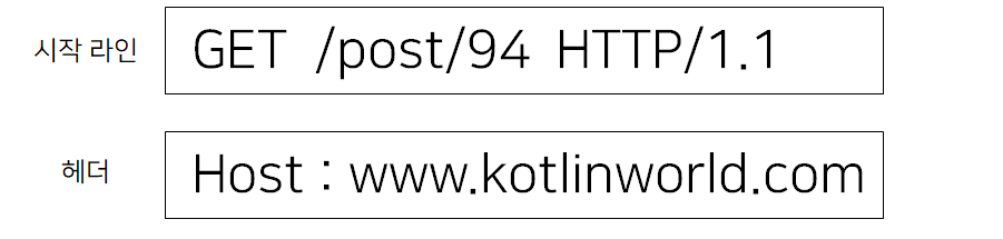 헤더에는 HTTP 메세지에 대한 정보를 명시한다. <그림7>과 같은 서버에 요청하는 시작라인은 헤더의 kotlinworld.com를 Host로 하는 서버에 날아가야 한다. TCP에서 목적지에 대한 정보가 들어가지만, 하나의 IP Address는 여러 Host를 가질 수 있으므로 다음과 같이 사용해야 어떤 Host에 시작 라인 메서드가 질의되어야 하는지 알 수 있다.
