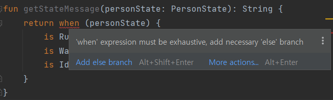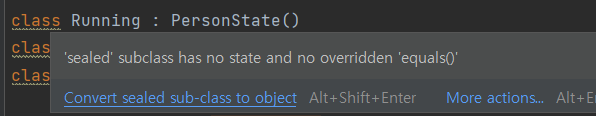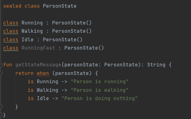 이때 컴파일러는 오류를 내뱉는다. sealed class인 RunningFast에 대한 처리가 안되어 있기 때문이다.
