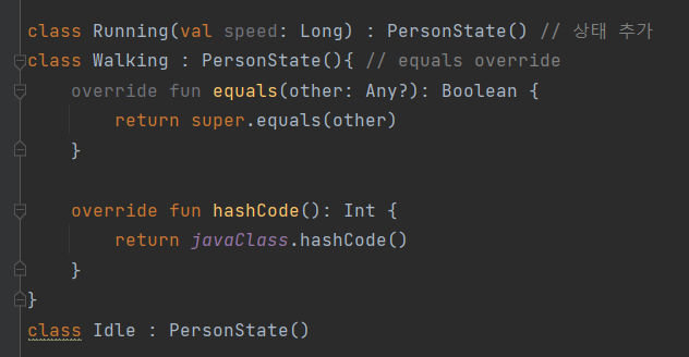 [그림1]에서와 달리 [그림4]에서는 오류가 생기지 않는다. 이유는 컴파일러에서 sealed class PersonState의 자식 클래스는 Running, Walking, Idle 세가지만 있는 것을 알고 있기 때문이다. 따라서 when에 else branch를 사용하지 않고도 필요한 메세지만 수신할 수 있게 되었다.